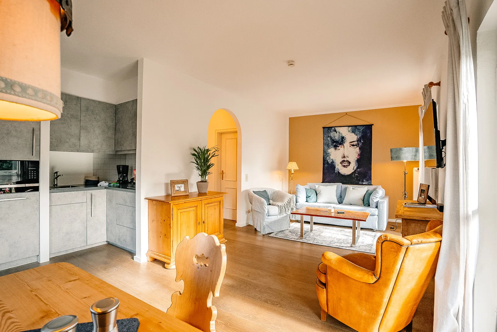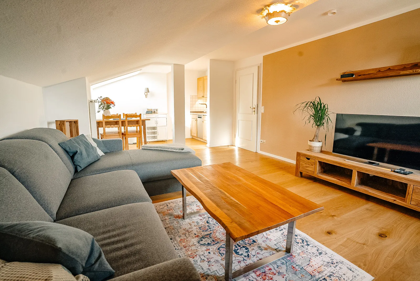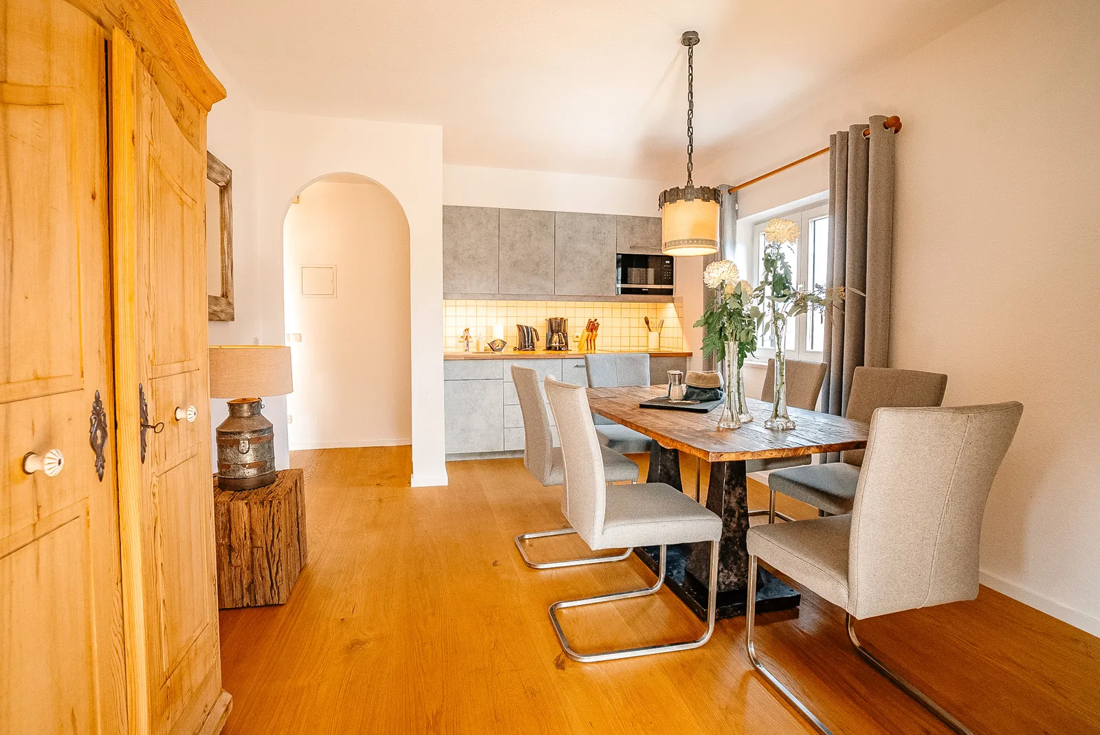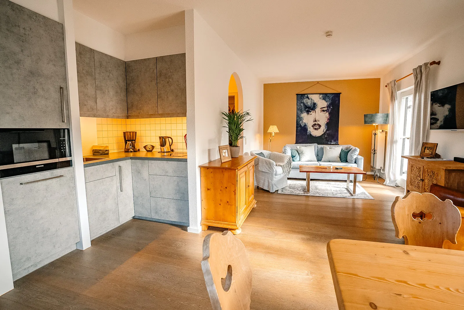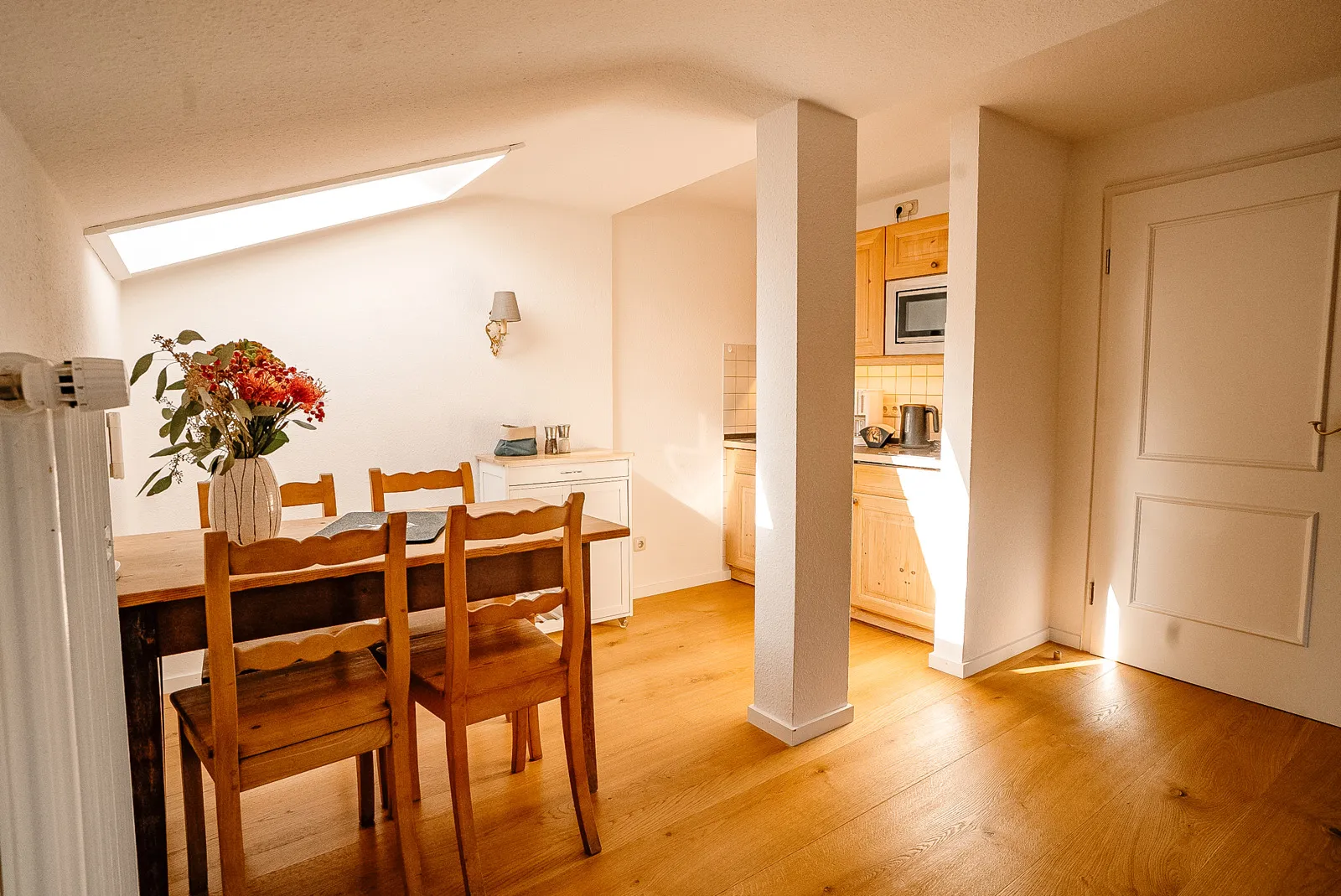 Our vacation apartment No. 1 has its own south-west facing terrace with sun until the evening. It has a large living room with dining area and a separate kitchen.
