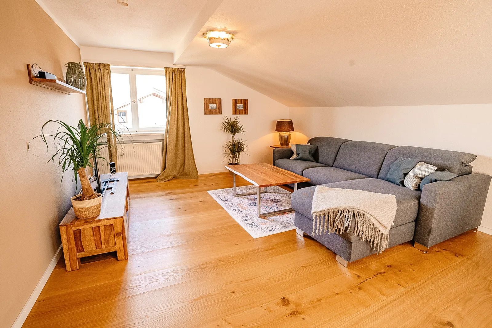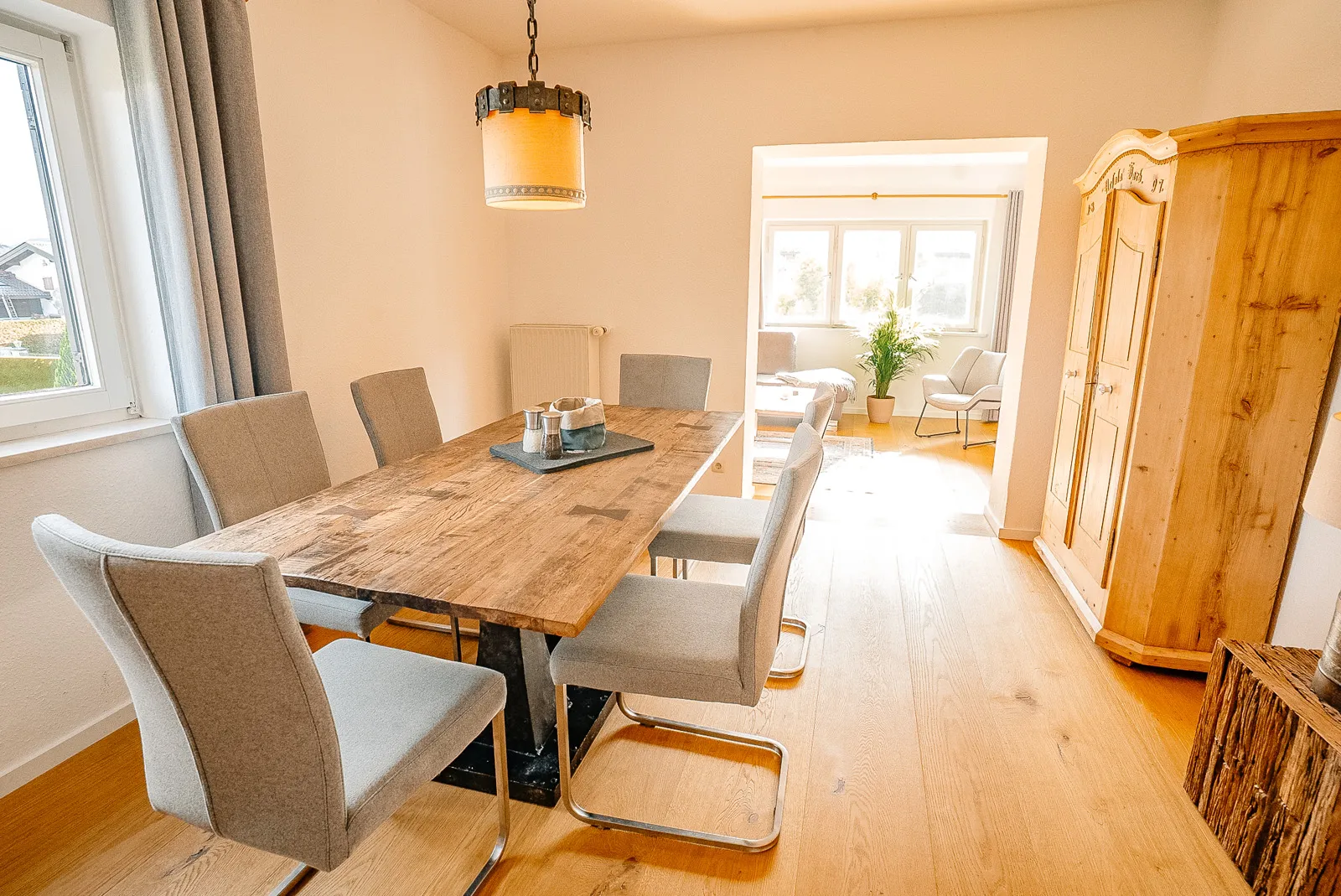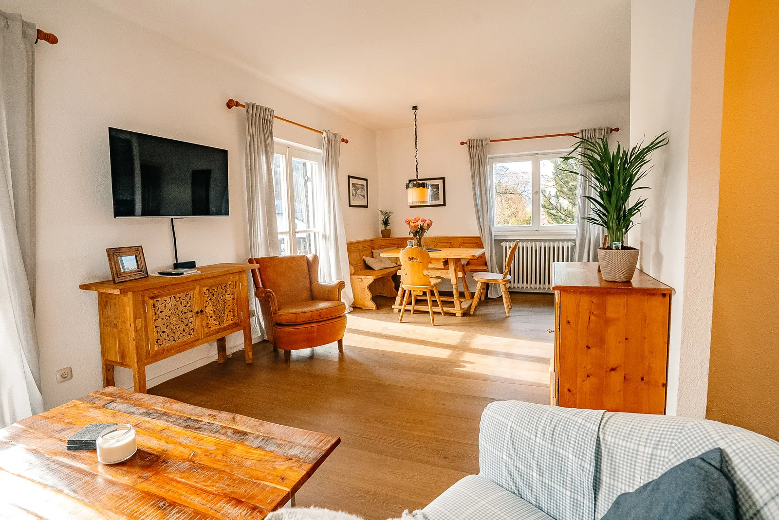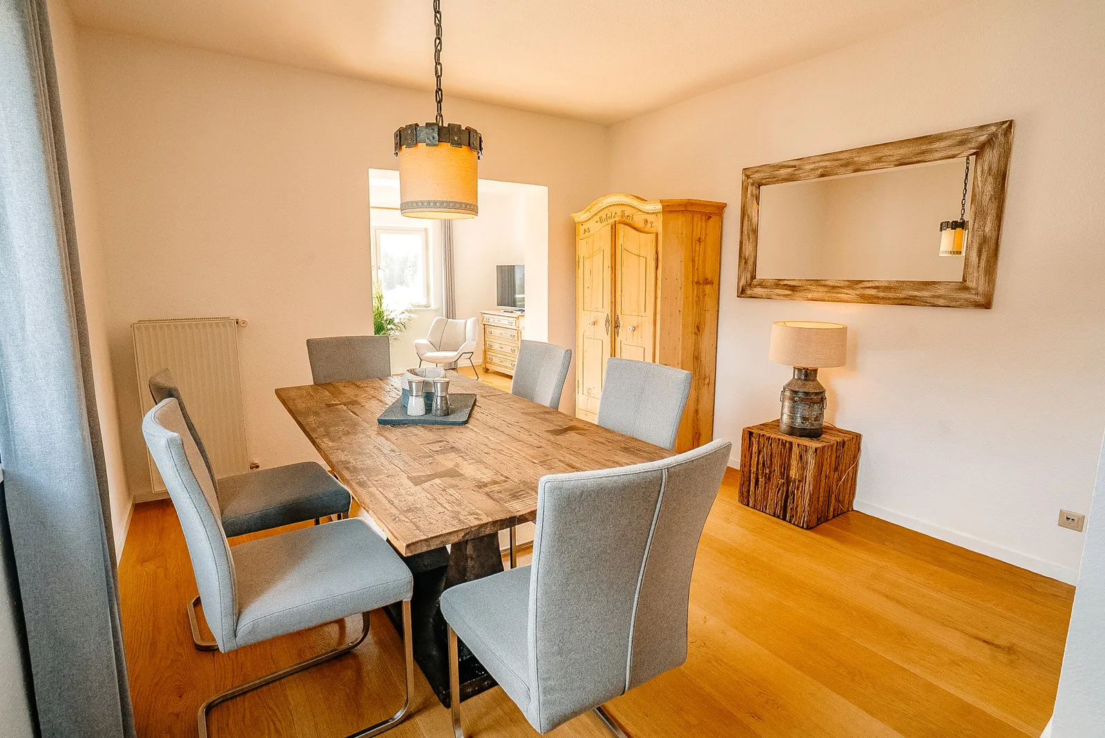 Our vacation apartment No. 1 has its own south-west facing terrace with sun until the evening. It has a large living room with dining area and a separate kitchen.