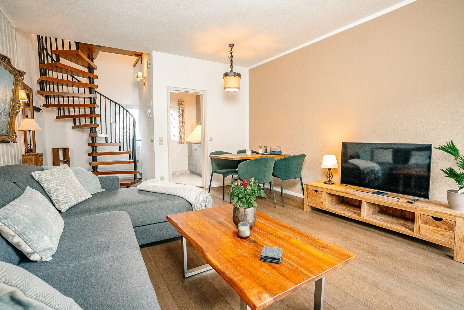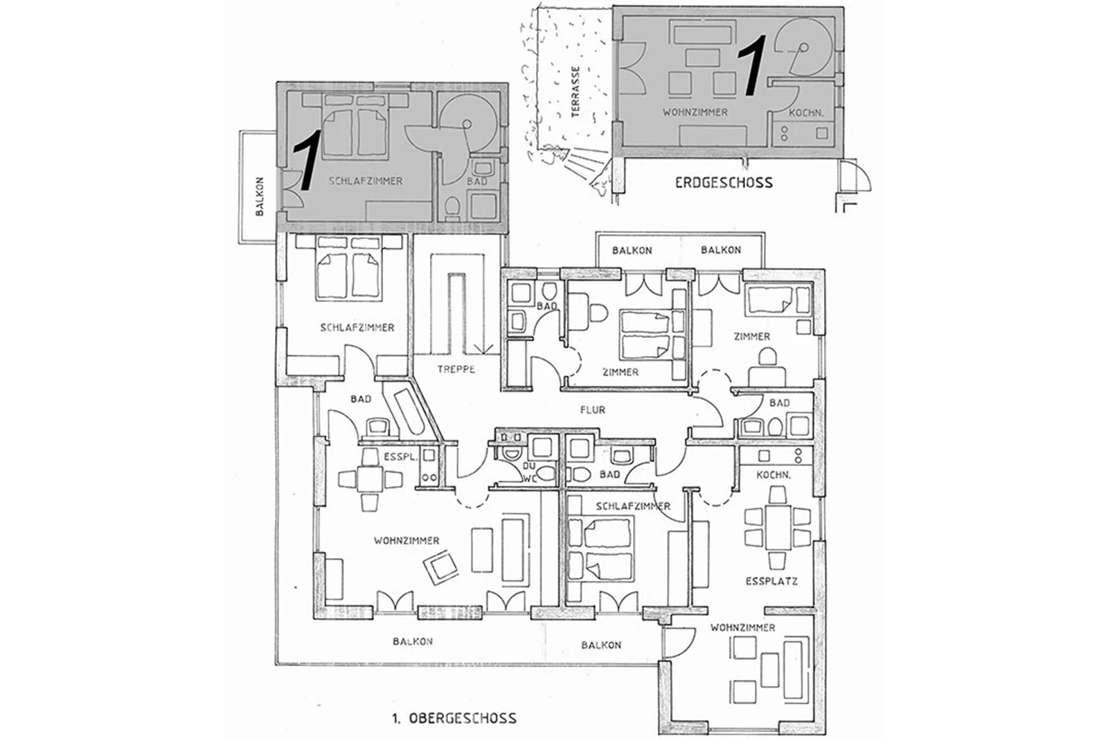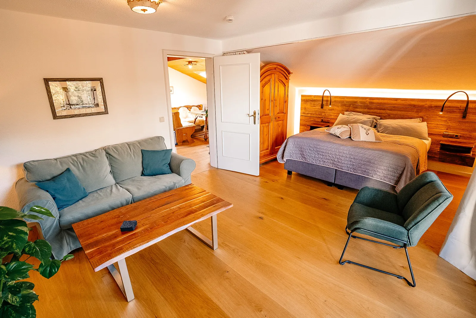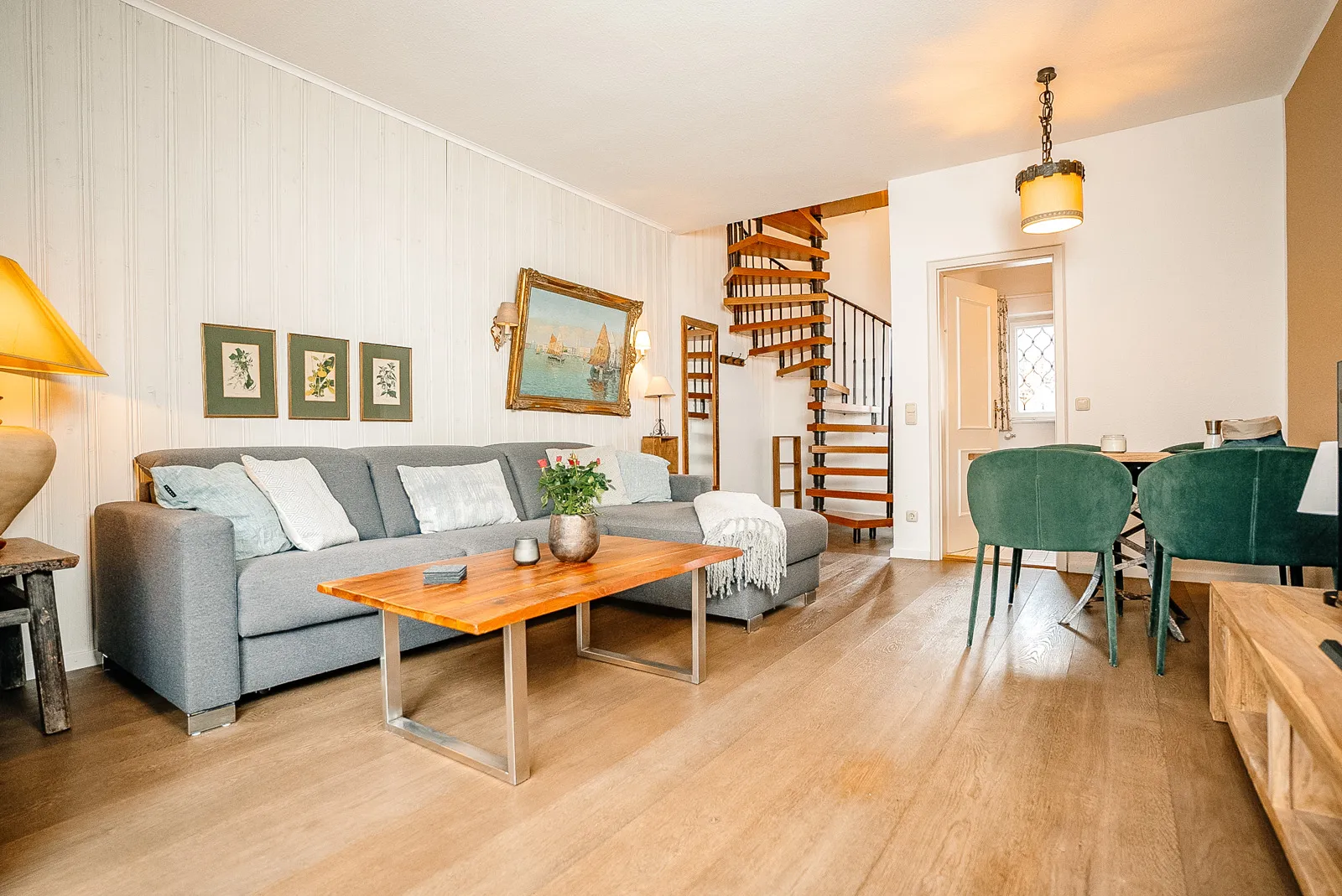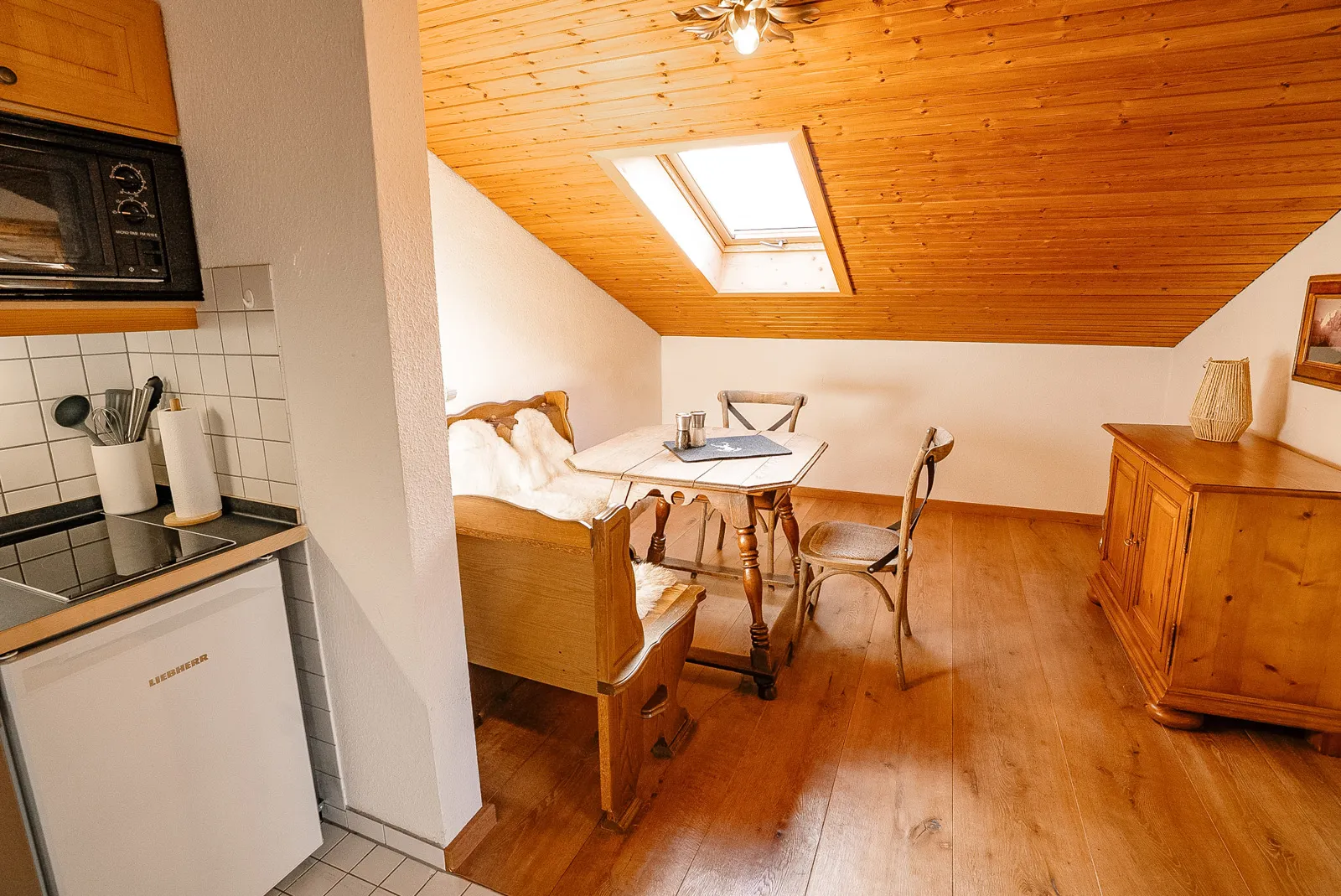 Our vacation apartment No. 1 has its own south-west facing terrace with sun until the evening. It has a large living room with dining area and a separate kitchen.
