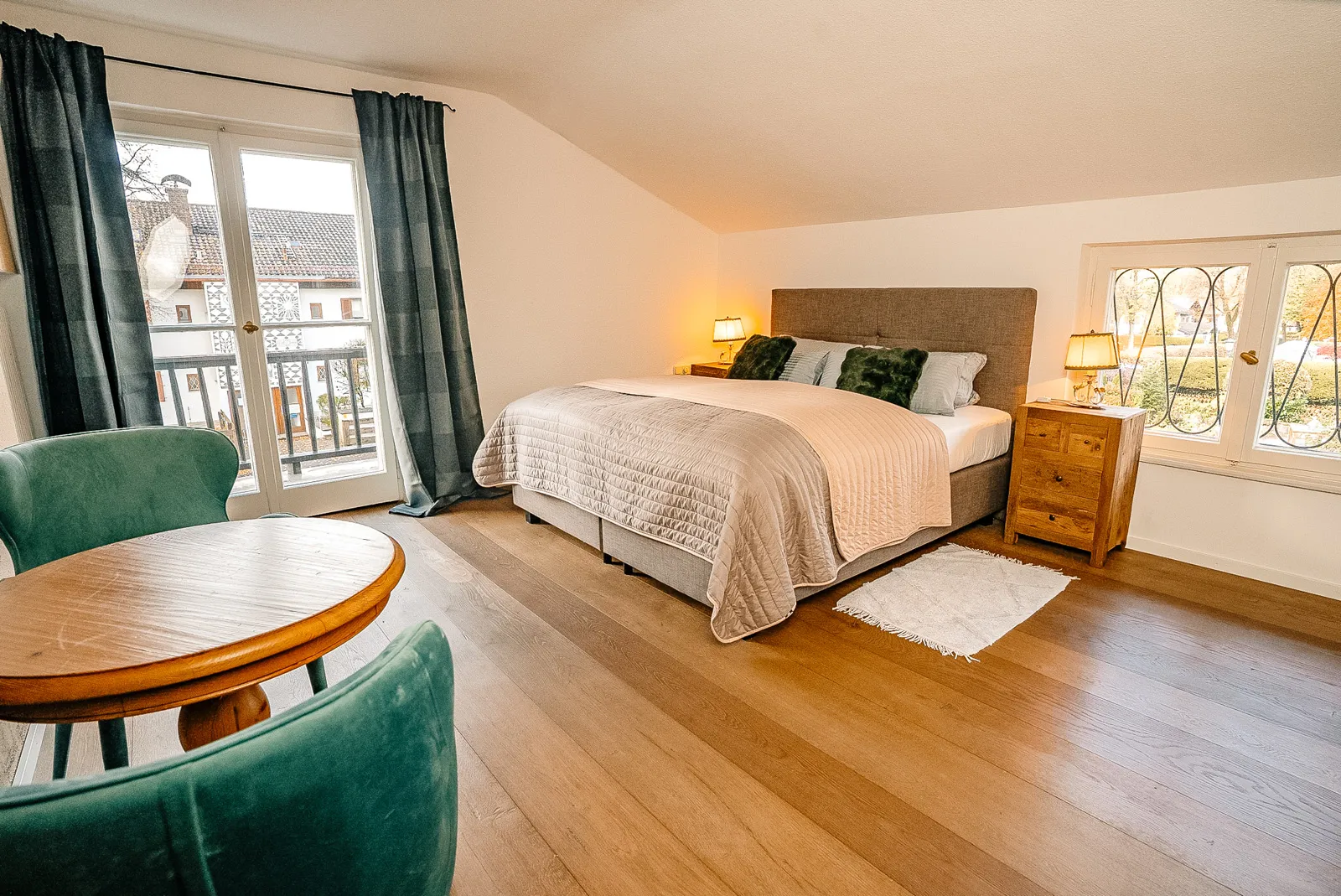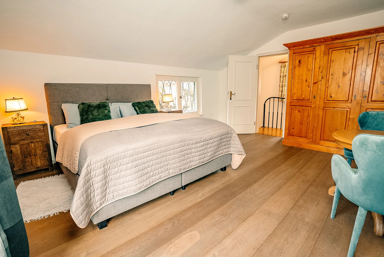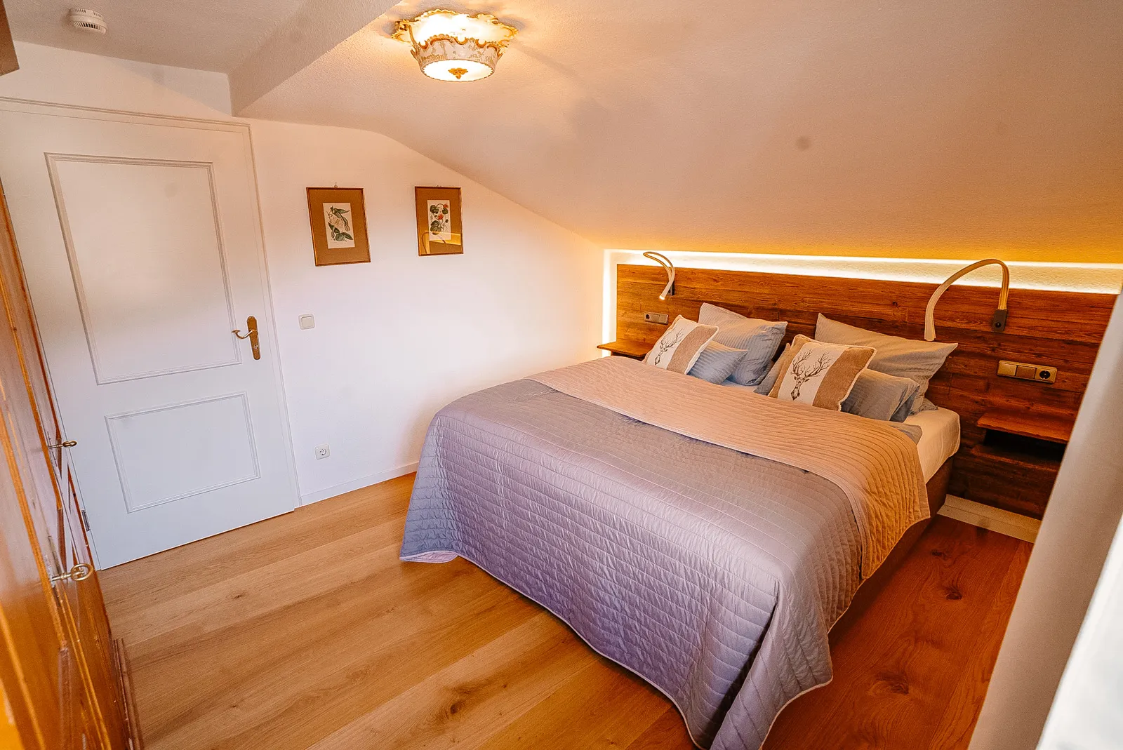 On the first floor is the large bedroom with a balcony overlooking the Alpspitze and Zugspitze massif, and the bathroom with shower.