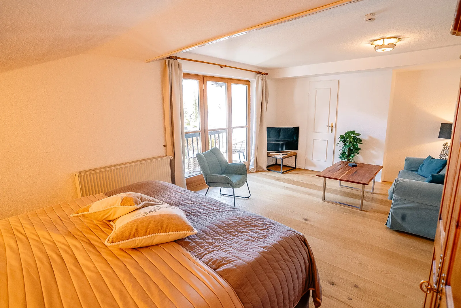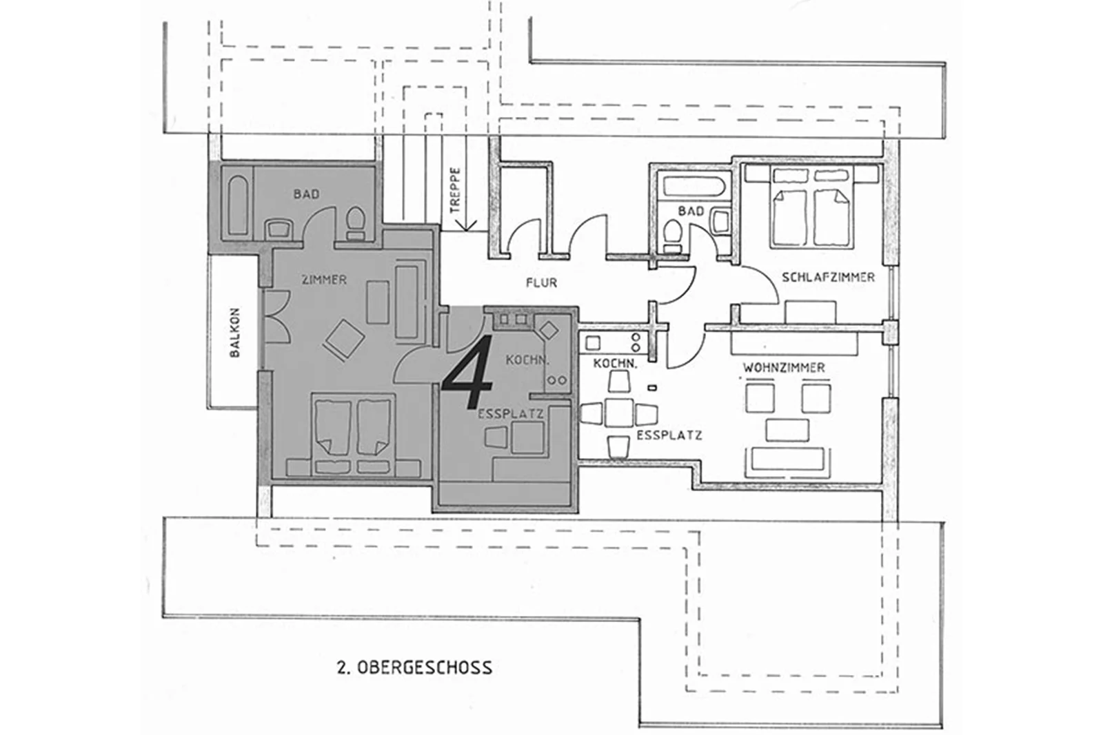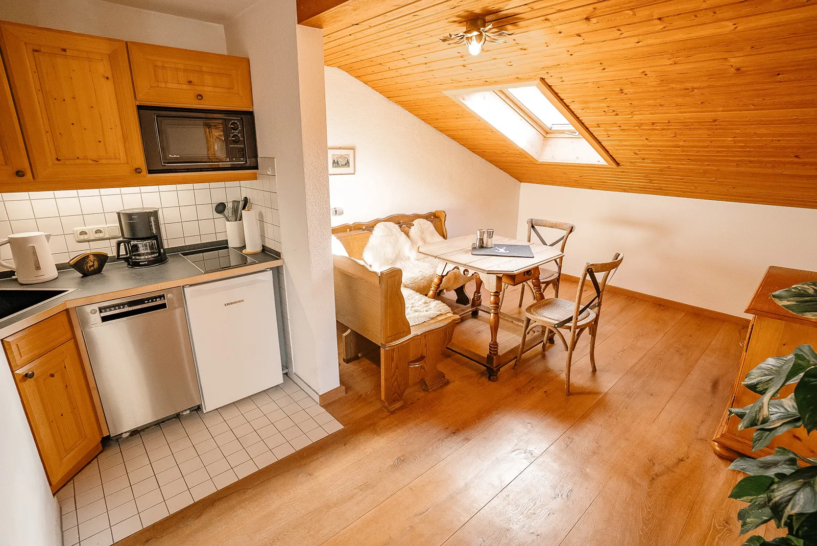 The largest vacation apartment, No. 2, has a large living room with dining area and kitchenette, a wonderful south-west facing balcony with views of the Wettersteinwand, the Alpspitze, and the Höllental valley, a beautiful bedroom, a bathroom with bathtub, and a separate bathroom with shower.