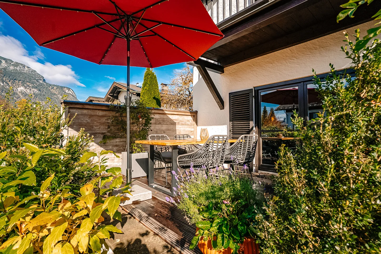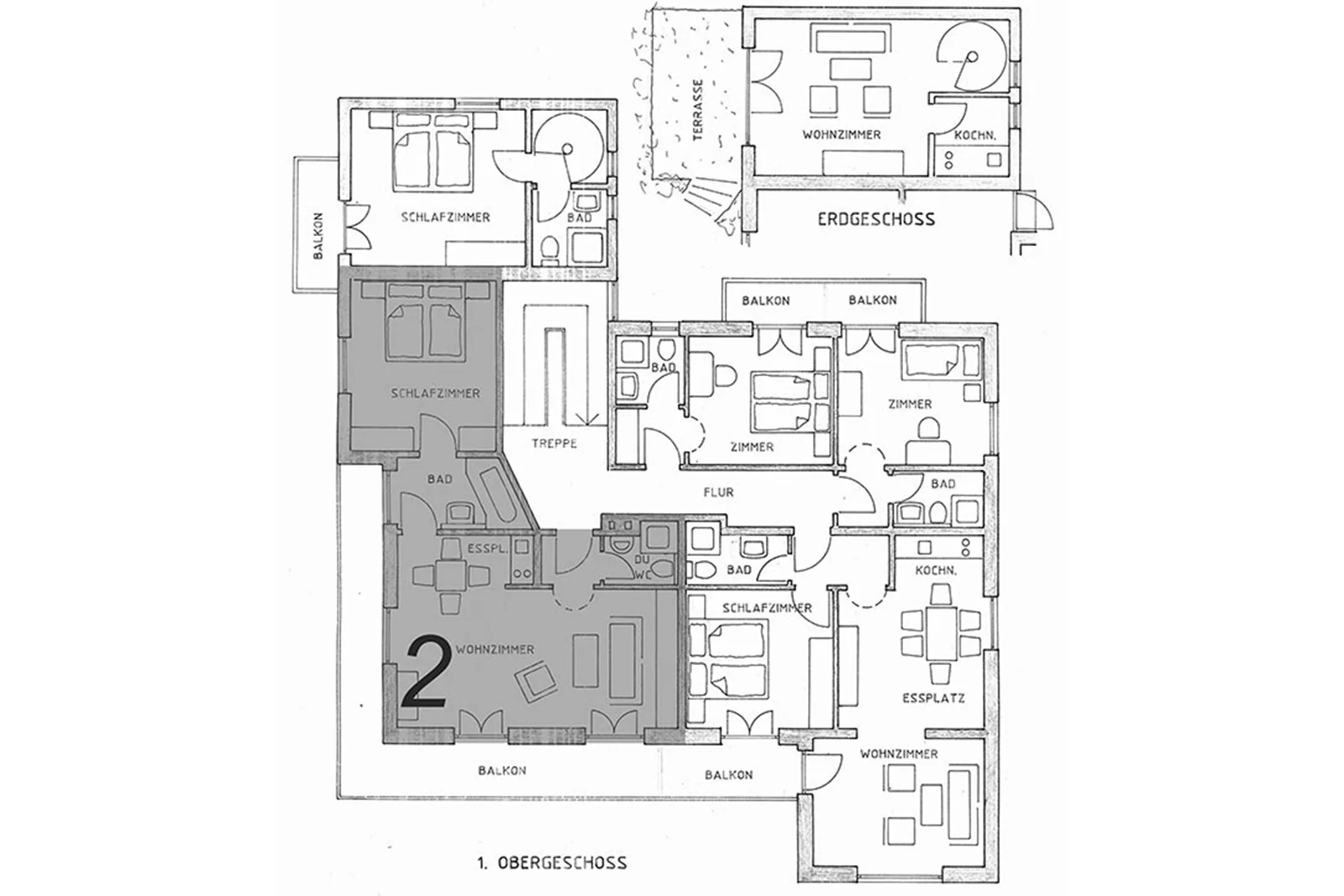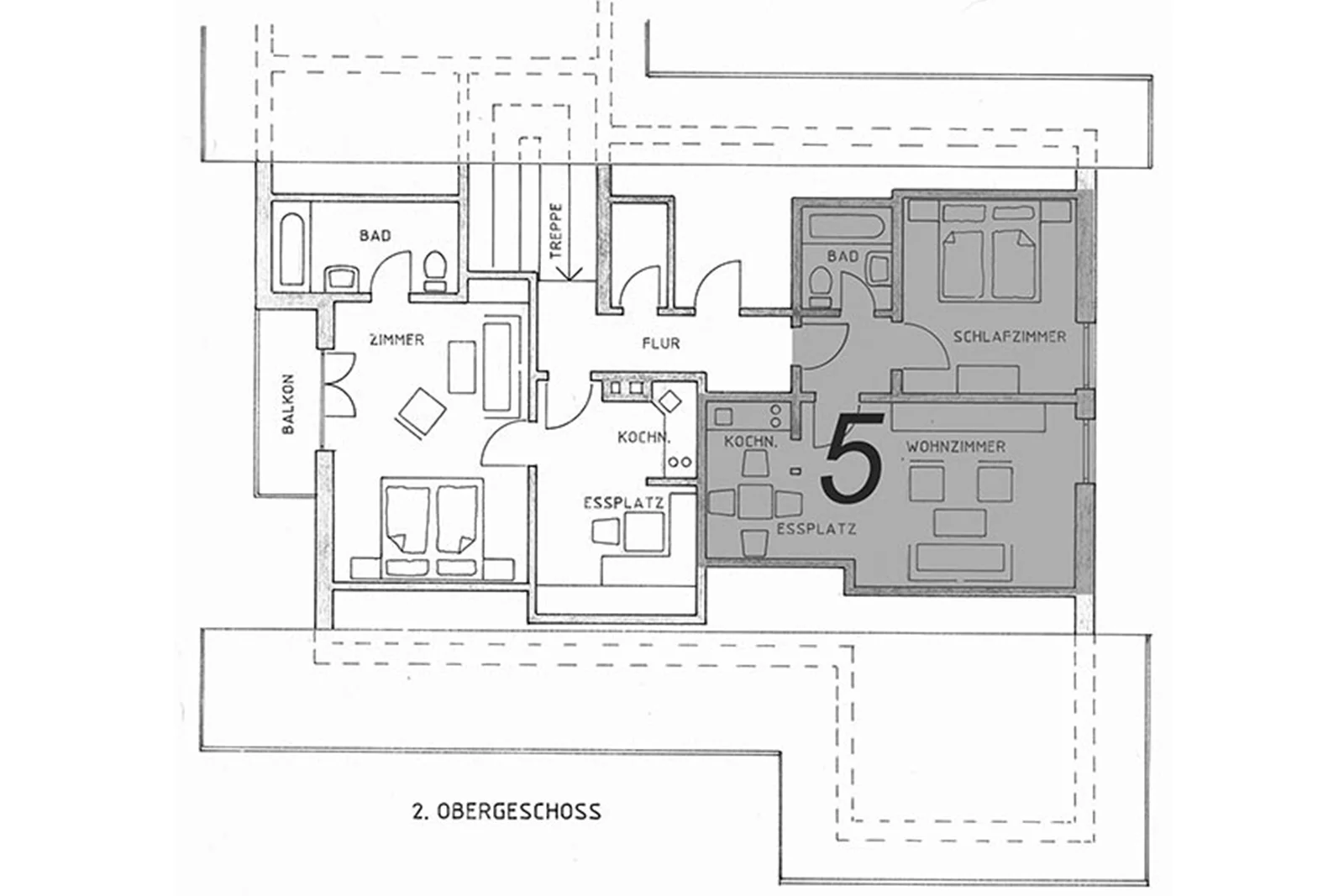 The largest vacation apartment, No. 2, has a large living room with dining area and kitchenette, a wonderful south-west facing balcony with views of the Wettersteinwand, the Alpspitze, and the Höllental valley, a beautiful bedroom, a bathroom with bathtub, and a separate bathroom with shower.