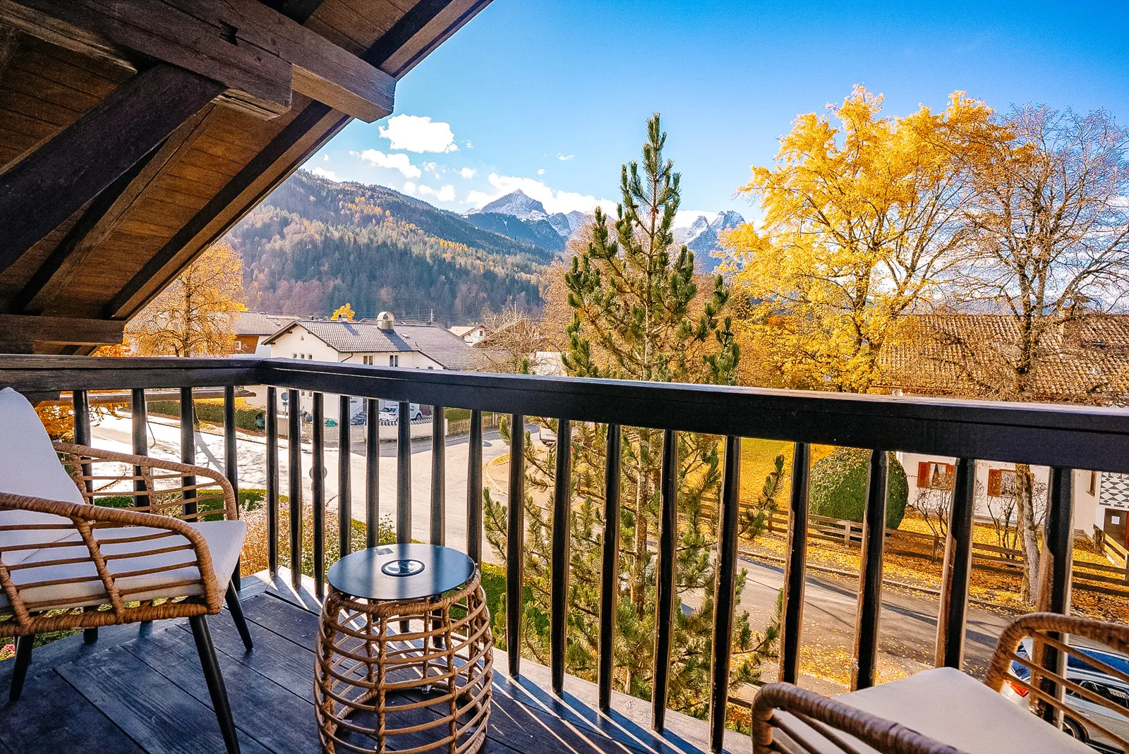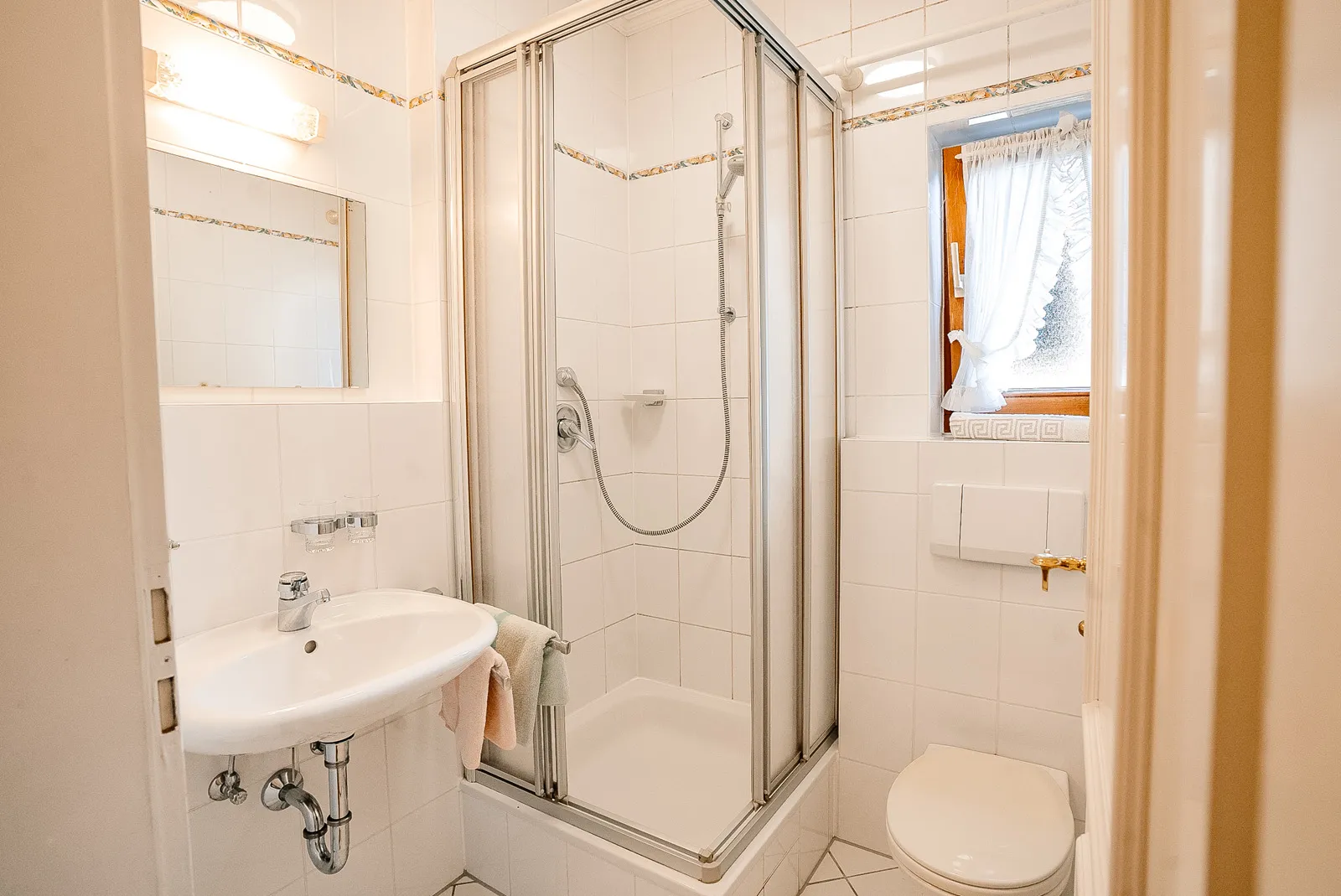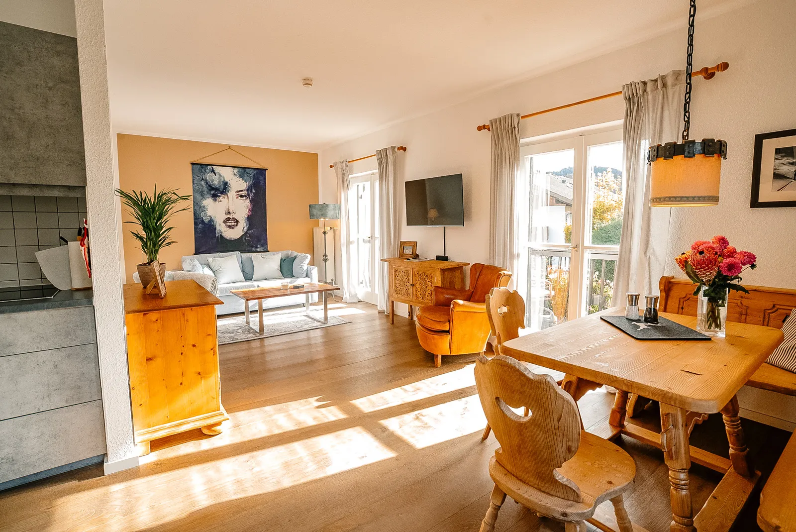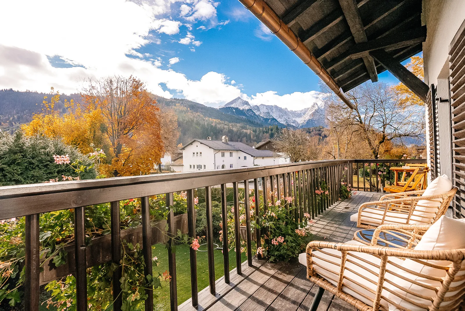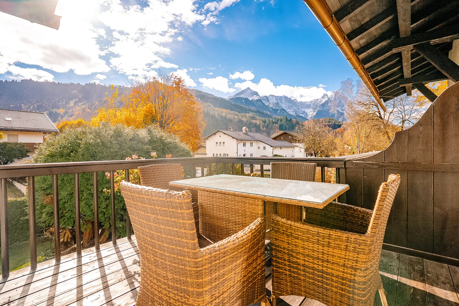 Vacation apartment No. 3 offers a large living and dining room with kitchenette, 3 beautiful bedrooms, and a warm south-facing balcony with views of the Wettersteinwand, Alpspitze, and Höllental. The 3 bathrooms are equipped with showers.