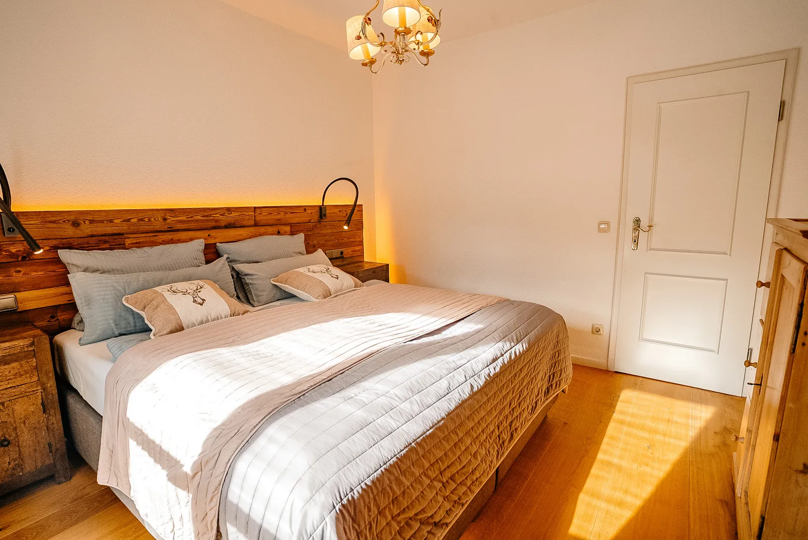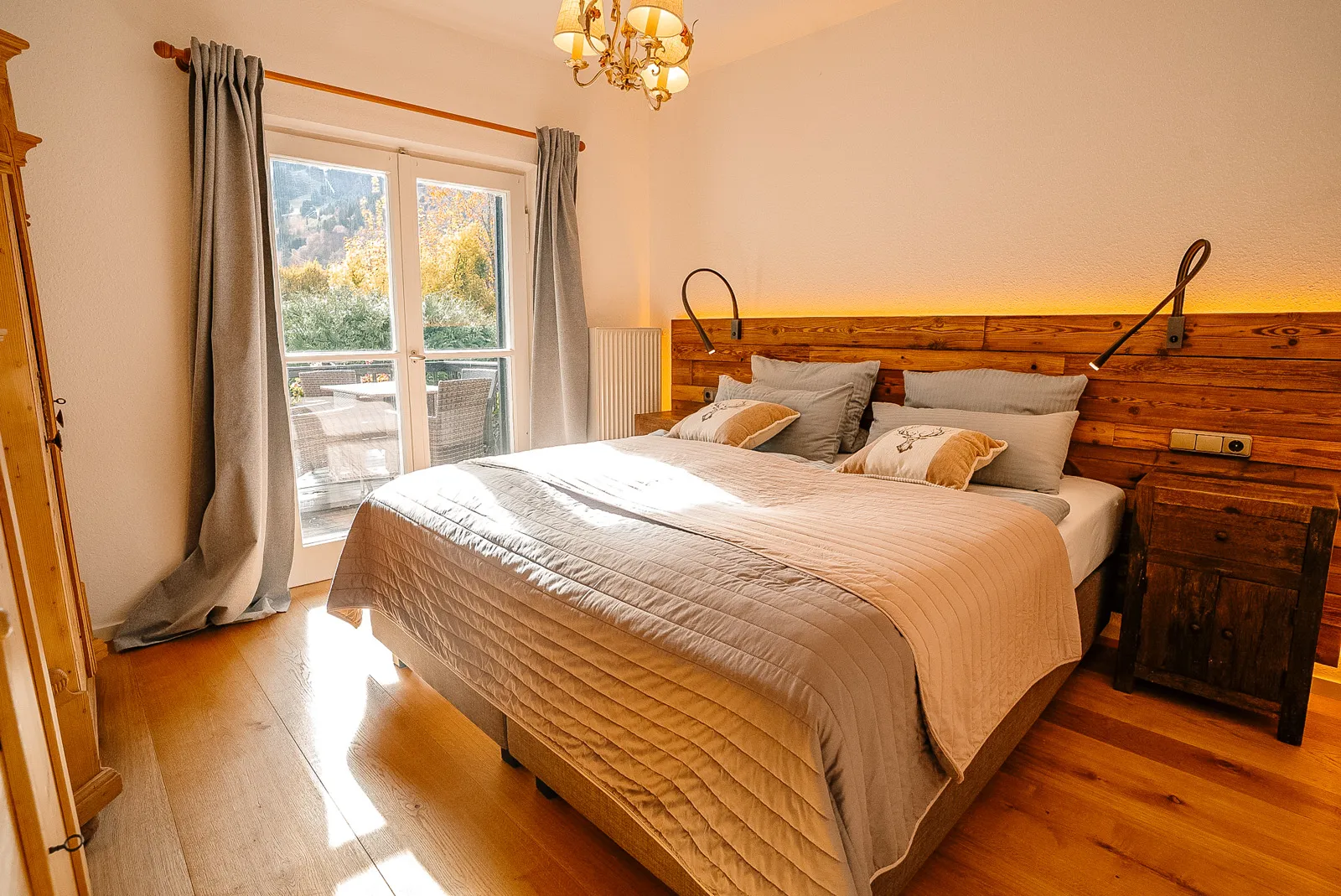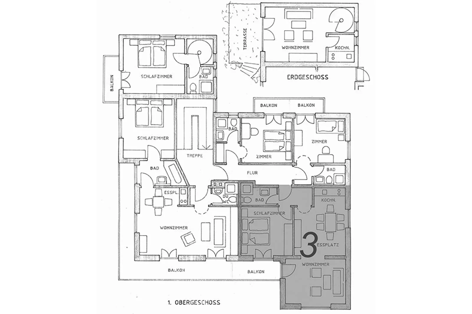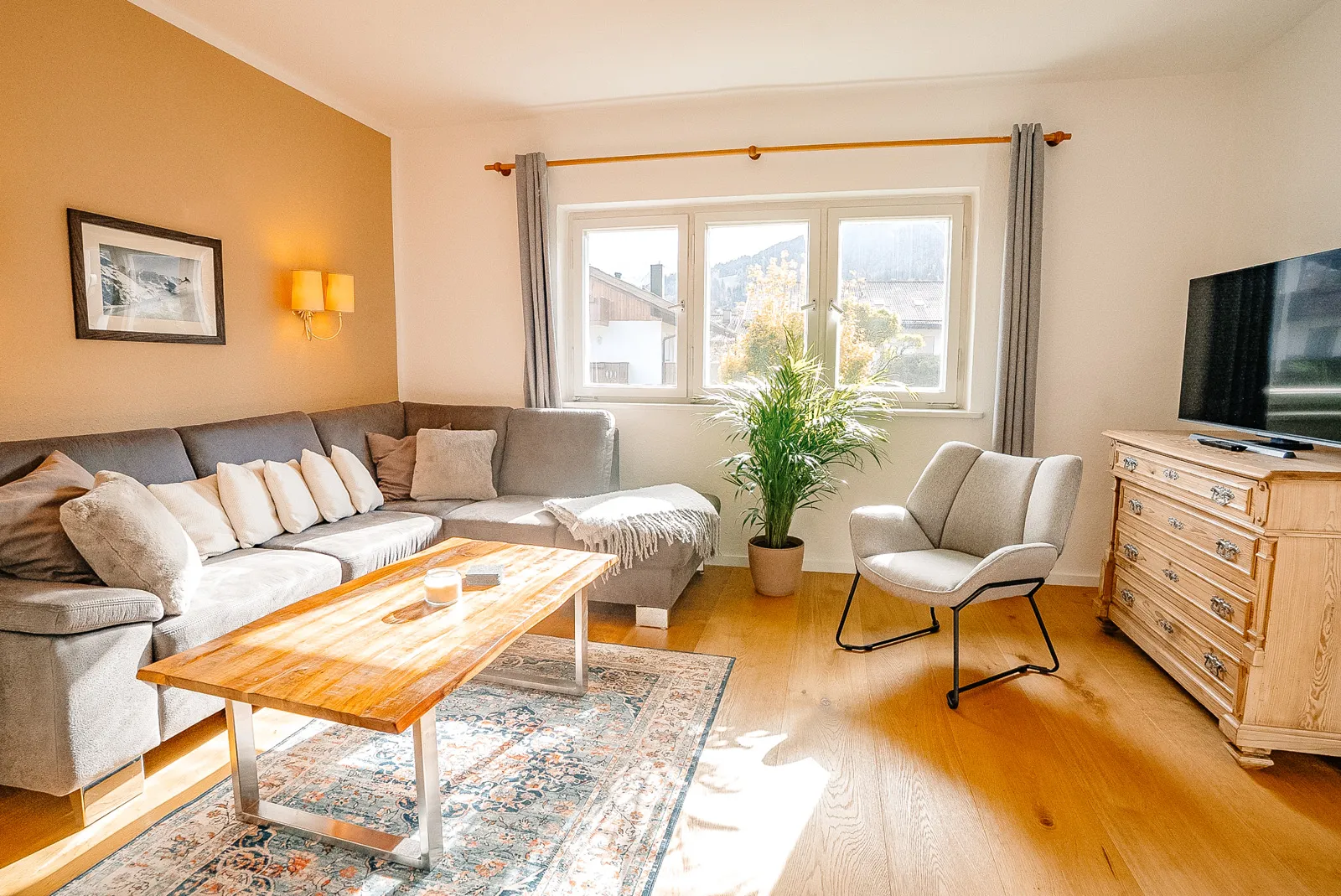 Vacation apartment No. 3 offers a large living and dining room with kitchenette, 3 beautiful bedrooms, and a warm south-facing balcony with views of the Wettersteinwand, Alpspitze, and Höllental. The 3 bathrooms are equipped with showers.