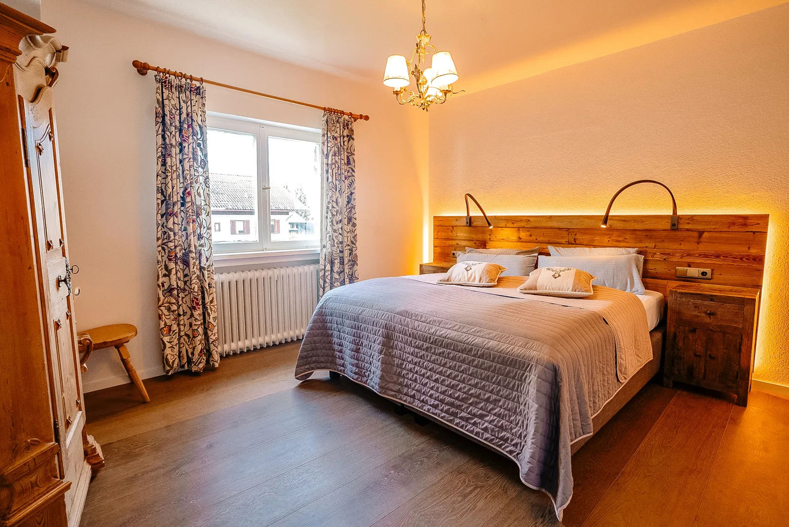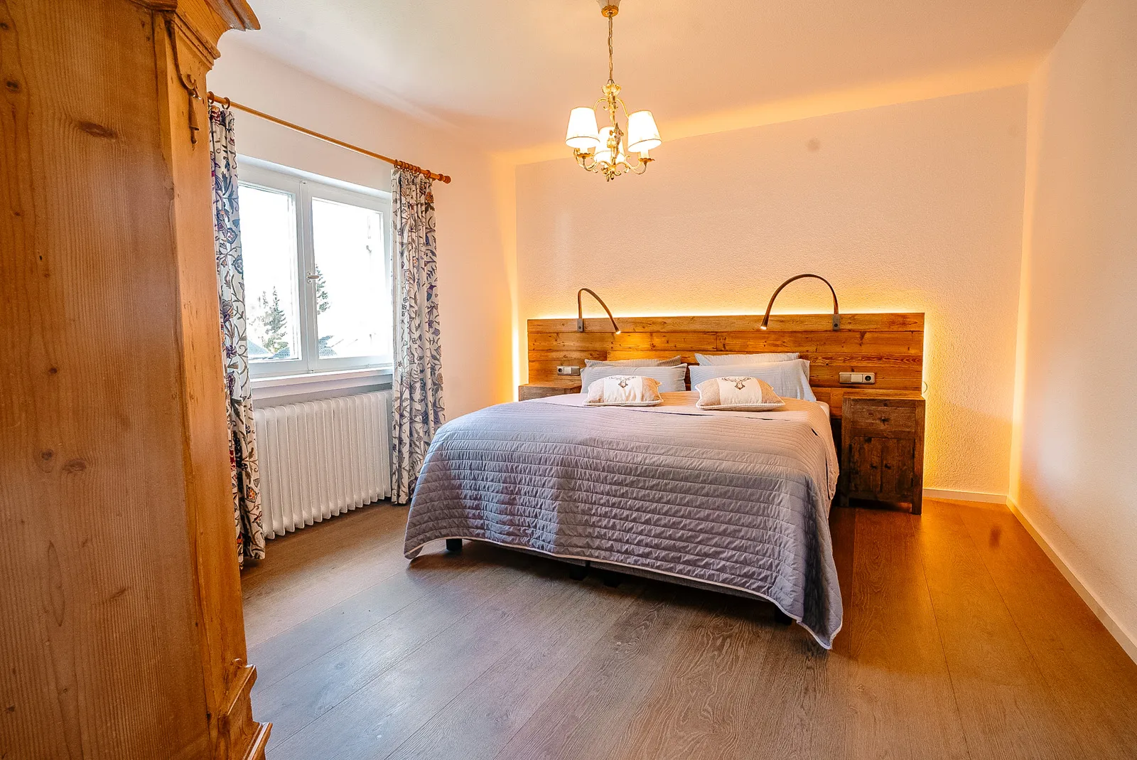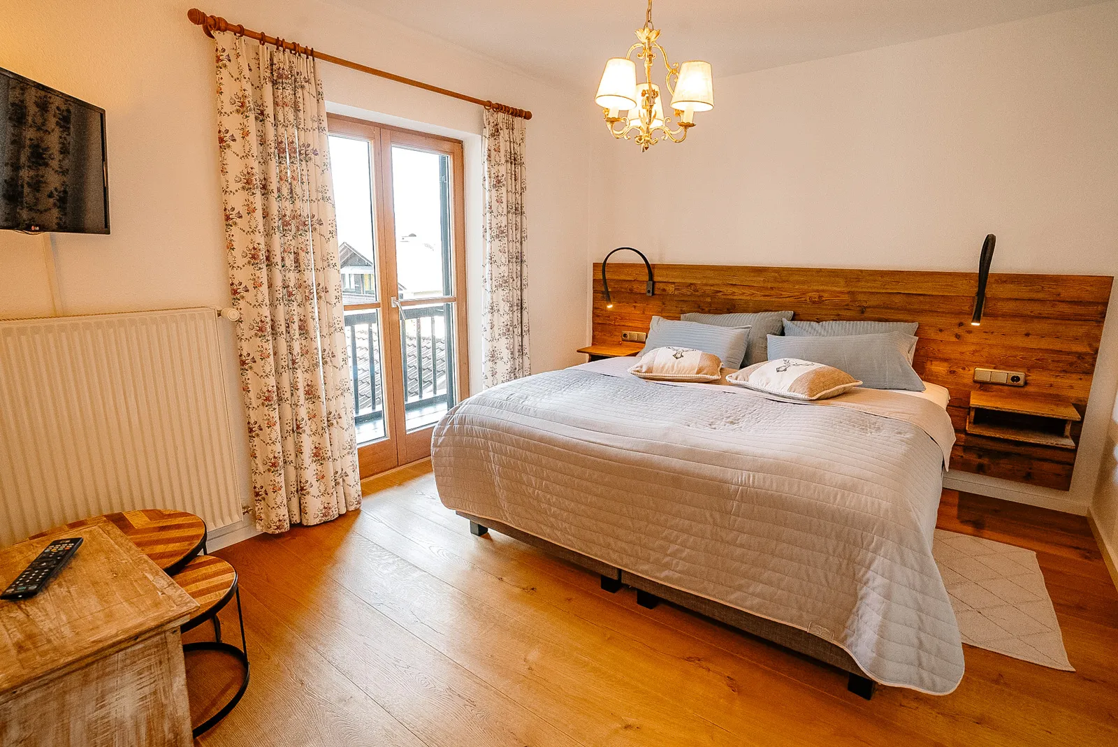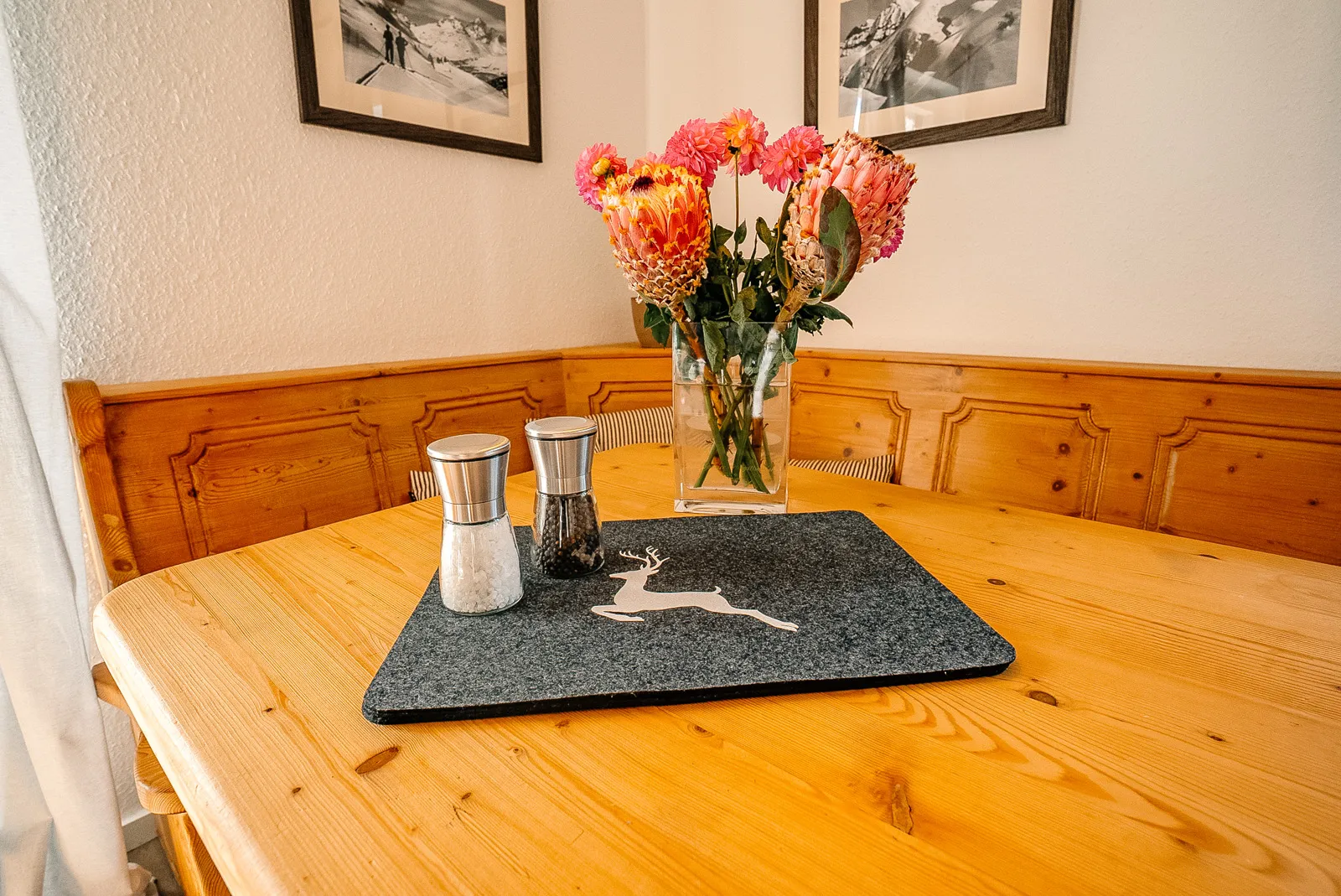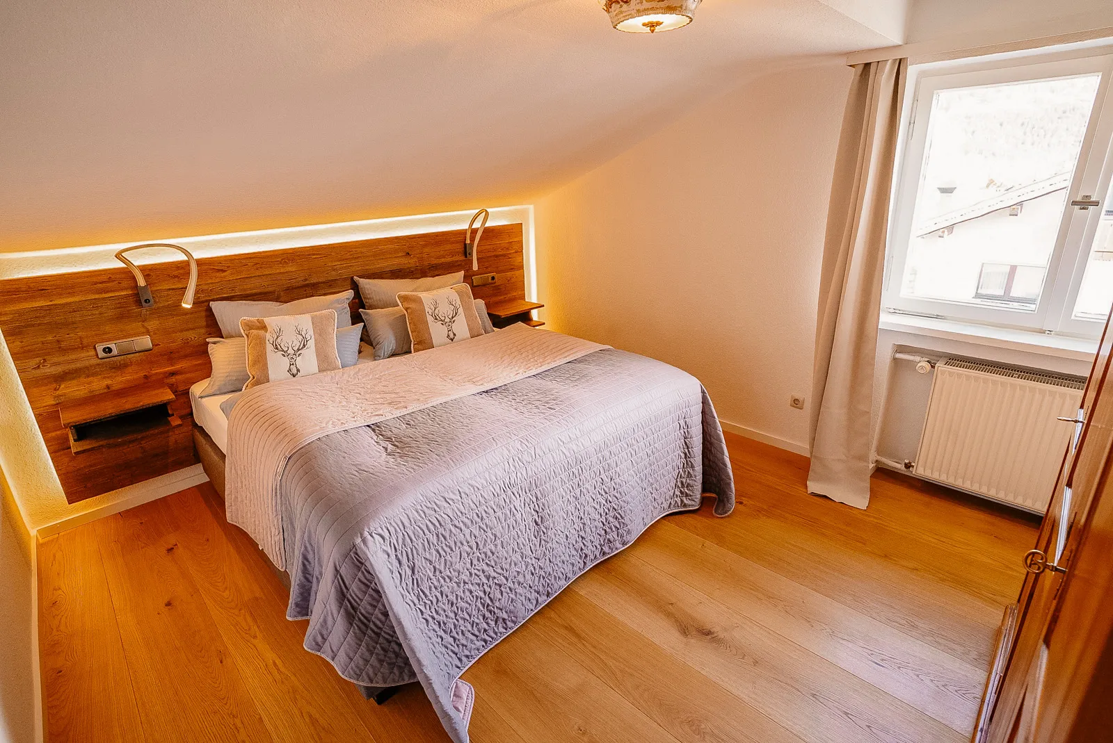 Vacation apartment No. 3 offers a large living and dining room with kitchenette, 3 beautiful bedrooms, and a warm south-facing balcony with views of the Wettersteinwand, Alpspitze, and Höllental. The 3 bathrooms are equipped with showers.